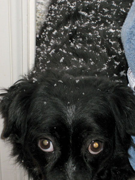 Mandy does not like the snow. She circled the patio trying to find a place where there wasn’t any, then headed for the door and was rather put out when I made her stop so I could get a shot of white snow on black dog.
