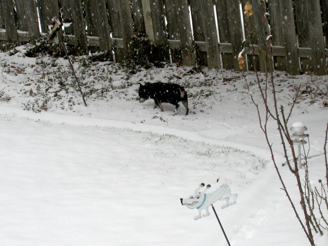 Mandy does not like the snow. She circled the patio trying to find a place where there wasn’t any, then headed for the door and was rather put out when I made her stop so I could get a shot of white snow on black dog.